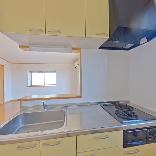 コンロ2口とシンクのあるキッチン(確度88%):ガスコンロ2口、シンク、レンジフードが揃ったコンパクトなキッチン。調理スペースはやや限られるが基本的な料理は問題なさそう。