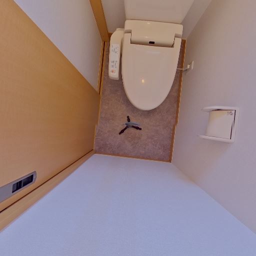 トイレ個室であること(確度95%):便器・温水洗浄便座付きの個室トイレ。紙巻器やリモコンも設置されている。
