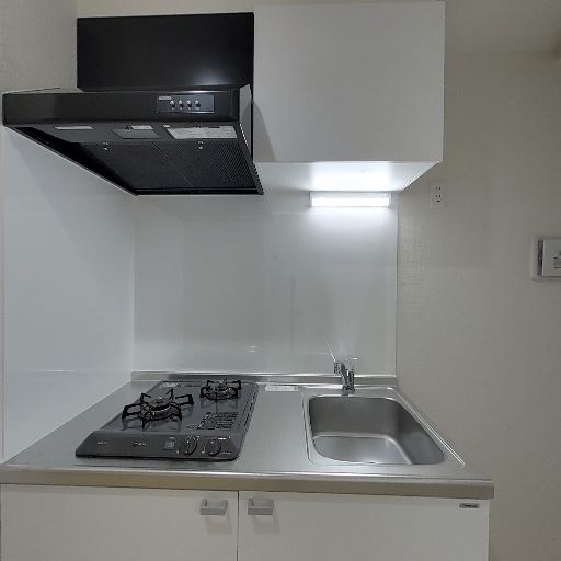 単身向けのシステムキッチン(確度86%):2口ガスコンロ、レンジフード、シンクが一列に収まったコンパクトなシステムキッチン。壁面パネルで油はね対策もされている。