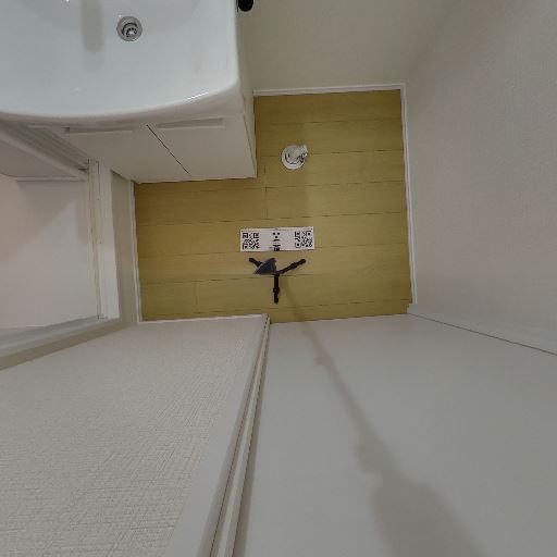 洗濯機置き場の存在(確度87%):床面に給水栓と排水口があり、洗濯機パン無しの設置スペースが確保されている。