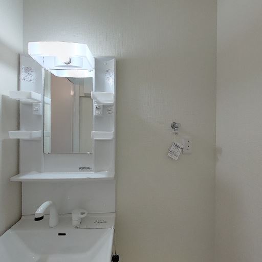 独立洗面台と収納付きミラー(確度92%):洗面ボウル一体型の独立洗面台があり、ミラー両側に小物棚と照明が付いている。