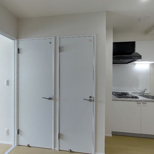 収納や個室への扉が2枚(確度70%):並んだ開き戸が2枚見える。収納や別室への出入口と考えられる。
