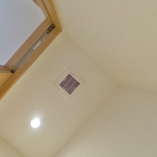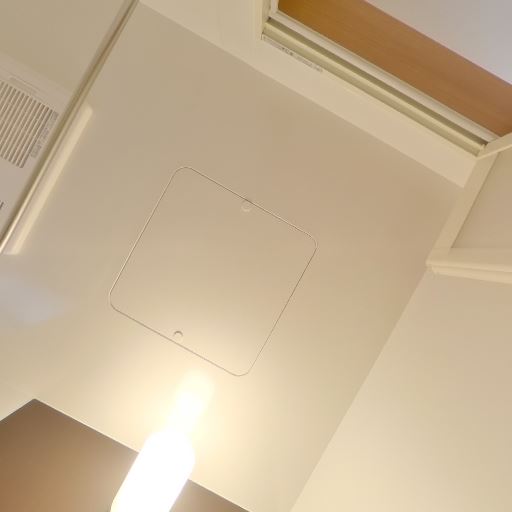 換気設備と天井照明(確度90%):天井に換気扇グリルとダウンライトが設置されている。
