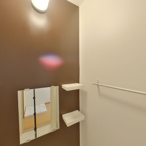 収納と小物置き(確度70%):壁面にミラーと小さな棚が2段あり、ボトル類や小物を置ける。