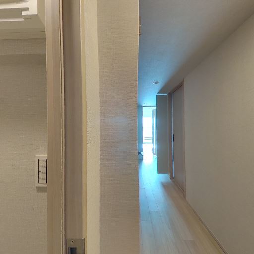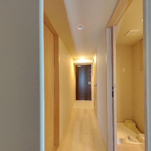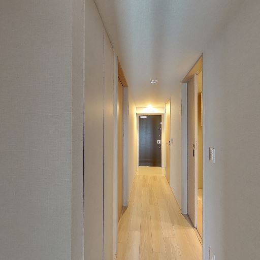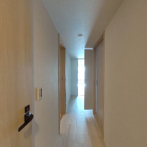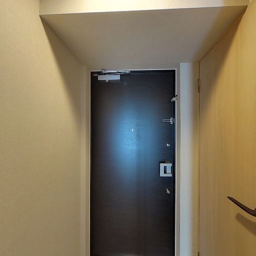 • 廊下の明るさと動線(確度73%):玄関方向に照明が点いており、一直線の廊下で各室への出入り口が左右に配置。床は明るい木目で清潔感がある。