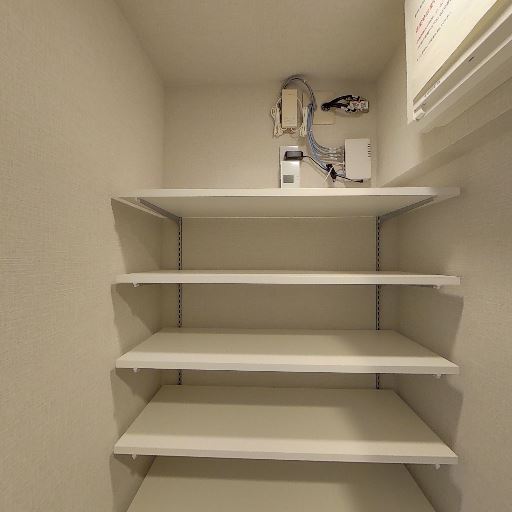 • 可動棚の収納スペース(確度86%):壁面レールに4段の可動棚があり、小物や日用品を整理しやすい。上部に通信/電源機器のような装置が設置されている。