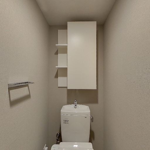 • トイレ設備と収納(確度90%):タンク付き洋式トイレと、便器上に吊戸棚+オープン棚が確認できる。