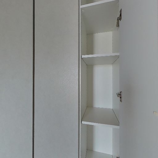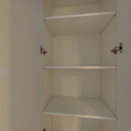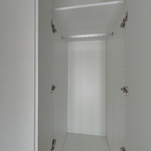 • 収納スペースあり(確度86%):扉付きのクローゼットと可動棚のある収納が見える。