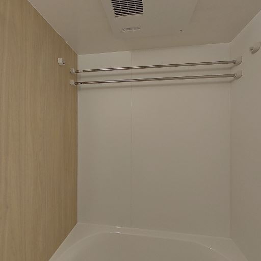 • 浴室乾燥・換気設備(確度90%):天井に換気扇と点検口があり、物干し用の2本のバーも設置されている。衣類乾燥や浴室のカビ対策に有効。