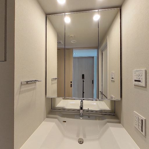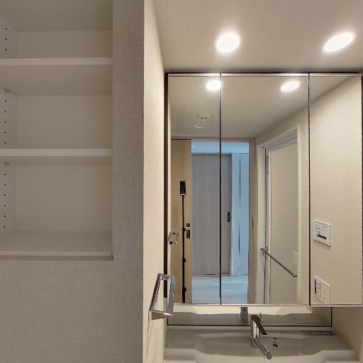 • 洗面台と三面鏡収納(確度90%):広めの洗面カウンターに三面鏡タイプの収納が備わっている。ミラー裏収納で小物が隠せる。