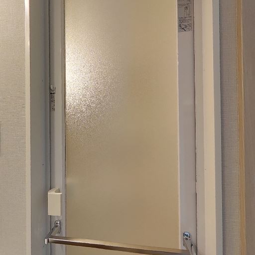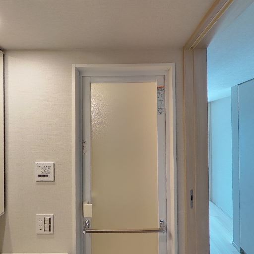 • 浴室入口と操作パネル(確度86%):曇りガラスのドアで浴室に接続。壁面に浴室・給湯系の操作パネルがある。