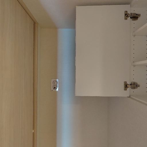 • 収納スペース(可動棚付き)(確度84%):扉の付いた縦長の収納があり、棚ダボ穴から棚板の高さ調整が可能。奥行きもあり、掃除道具や日用品のストックをまとめて置けそう。