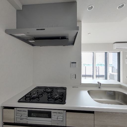• キッチン設備の新しさ(確度82%):ビルトインガスコンロとレンジフード、シンク一体のカウンターが見え、面材もきれいで使用感が少ない。