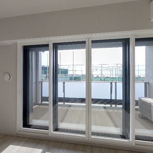 • 大きな掃き出し窓とバルコニー(確度90%):全面に大きなガラス戸が並び、その先にバルコニーがある。外部の光が十分入り、視界も抜けている。