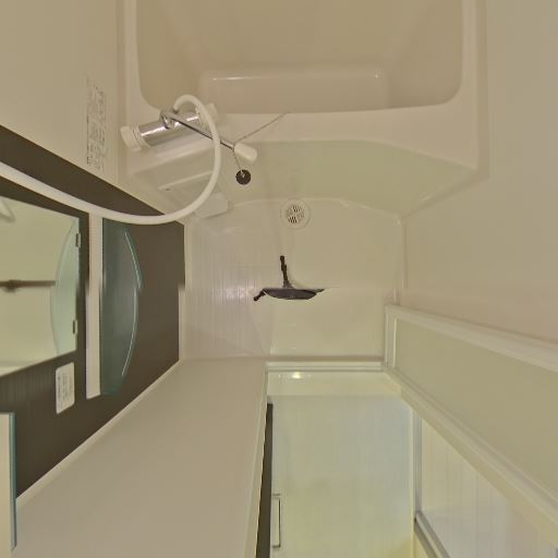 • 浴槽とシャワーのレイアウト(確度80%):コンパクトな浴槽とシャワー水栓の一般的なユニットバス。足元に排水口があり、床は段差少なめ。