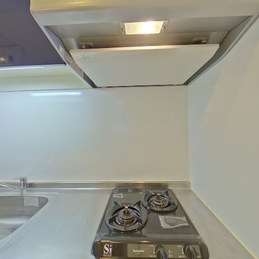 • 2口ガスコンロとレンジフード(確度90%):シンク横に2口ガスコンロが備わり、上部にレンジフードが設置されている。調理スペースはややコンパクト。