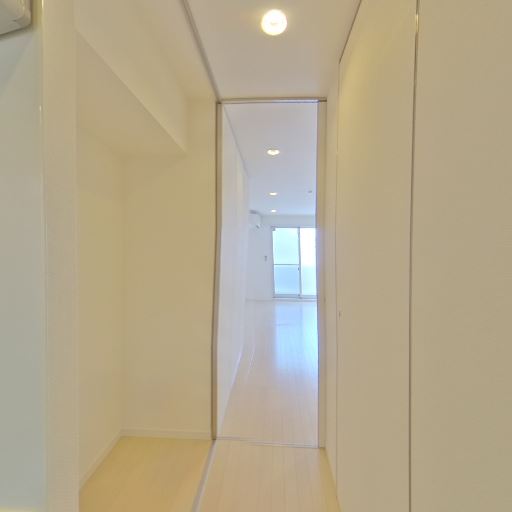 • 玄関から居室までの一直線動線(確度72%):玄関扉から奥の居室へ細長い廊下が続いている。視線の抜けがあり、奥にバルコニー窓が見える。