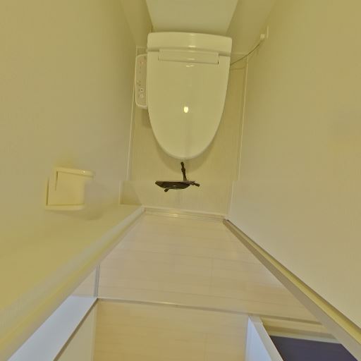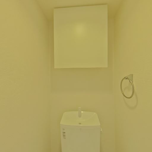 • 独立トイレスペース(確度90%):ドアの先に細長い個室トイレがあり、便器・手洗い一体型タンクと上部吊戸棚が設置されている。