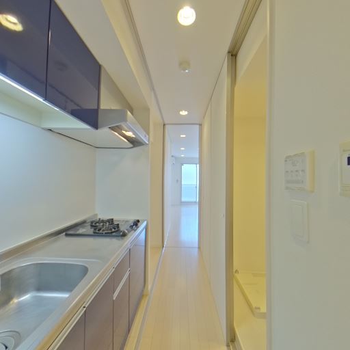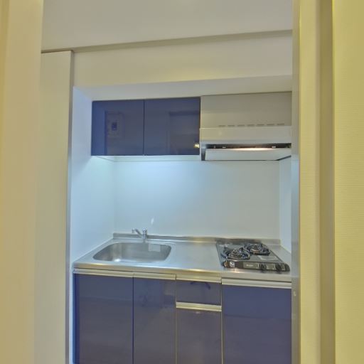 • 廊下型キッチン(確度90%):2口ガスコンロとシンク、上部吊り戸棚のある壁付けキッチン。通路型で縦に細長い。