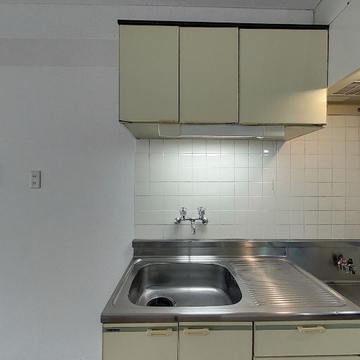 キッチンの状態(確度78%):ステンレスシンクと作業台が比較的きれいで、タイル壁も清潔感がある。上部吊戸棚も揃っており収納量はまずまず。
