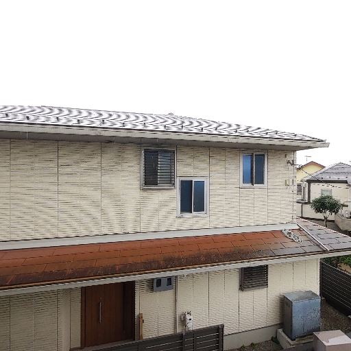 周辺視界は住宅街で抜け感は中程度(確度71%):向かいに隣家の外壁や屋根があり距離は近いが、片側は開けており道路・駐車場・樹木が見える。