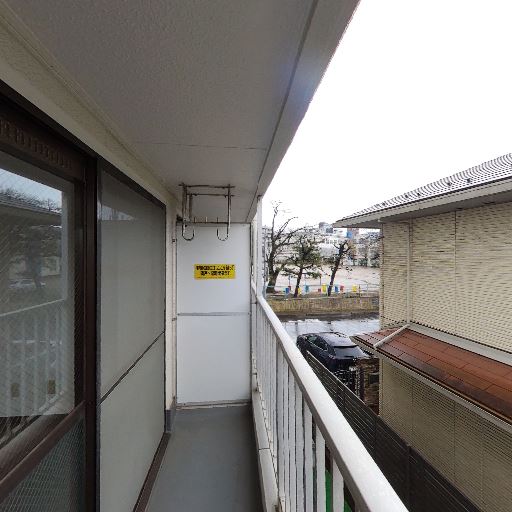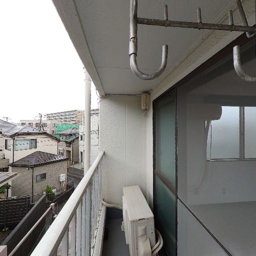 バルコニーの奥行きはやや狭め(確度77%):手すりと窓面の距離が小さく、室外機で通路幅がさらに圧迫されている。