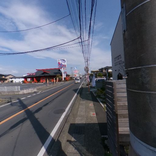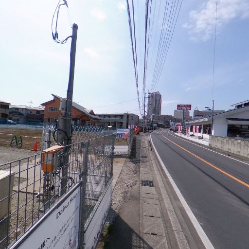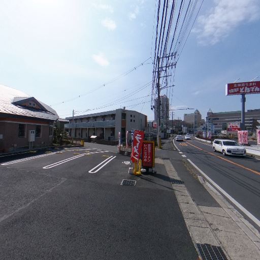 • 前面道路は交通量のある幹線っぽい(確度82%):片側1車線の直線道路で商業施設や看板が並び、車が通行している。歩道は狭め。