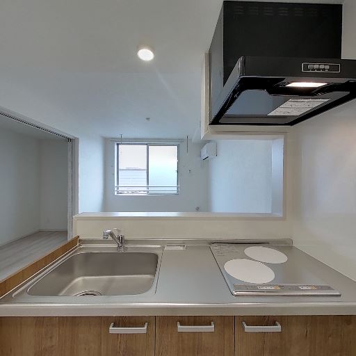 • 対面キッチンと2口IHコンロ(確度88%):シンク横に2口IHクッキングヒーターと換気フードがあり、カウンター越しにリビング側が見える対面型。