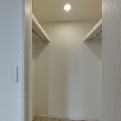 • ウォークインクローゼット(確度86%):左右にハンガーパイプと棚がある奥行きのある収納スペース。天井ダウンライト付き。