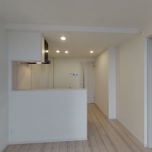 • 照明ダウンライトで明るい(確度90%):キッチン側天井に複数のダウンライトが設置されている。