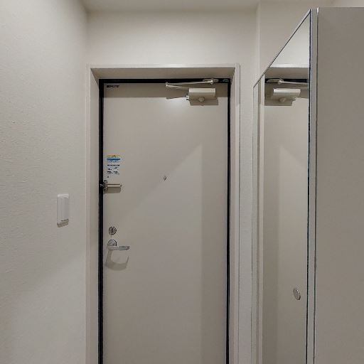• 玄関ドアと姿見収納(確度86%):玄関ドアの横に全身が映る鏡付き収納がある。外出前の身だしなみ確認や収納力の点で実用的。