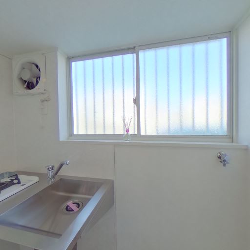 キッチンに大きめの窓があり明るい(確度92%):シンク前の壁面に横長の大きな窓があり、すりガラス越しでも十分な自然光が入る構成に見える。