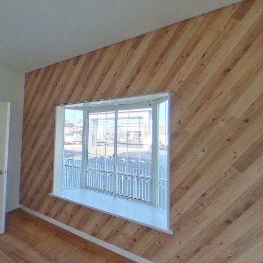木目アクセント壁のデザイン性(確度94%):一面に斜め貼りの木目調アクセント壁があり、室内の印象に個性と温かみを与えている。