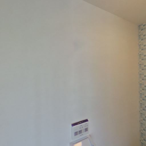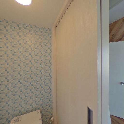 アクセントクロスで内装にデザイン性がある(確度91%):便器背面側と思われる壁に青系のモザイク調クロスが使われており、白基調の空間に対して程よいアクセントになっている。