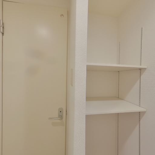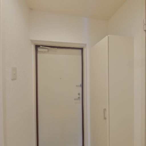 玄関収納が備わっている(確度91%):玄関脇に縦長の収納扉があり、加えて可動棚と思われるオープン棚も設置されているため、靴や小物を整理しやすい構成に見える。