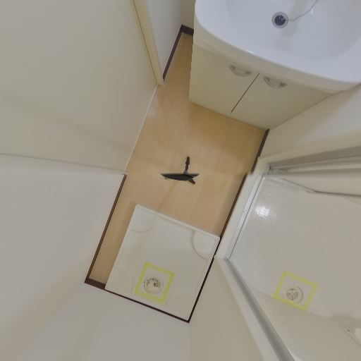 洗濯機置き場が室内に確保されている(確度96%):床面に防水パンと排水口があり、洗濯機置き場が室内に設けられていると判断できる。