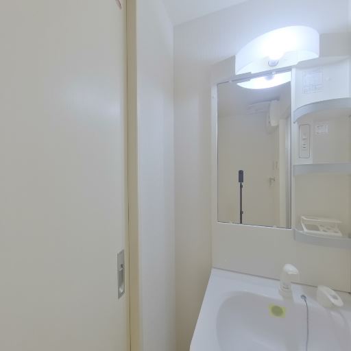 洗面台と浴室が近く水回り動線がまとまっている(確度91%):洗面台のすぐ隣に浴室入口があり、限られた空間の中で水回り設備がコンパクトに配置されている。