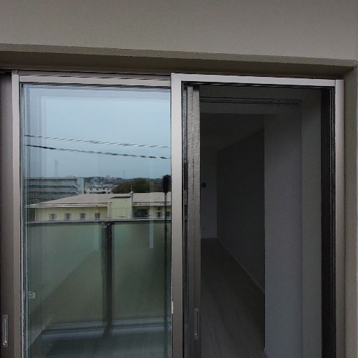 採光とバルコニー(確度86%):掃き出し窓とその先のバルコニーがあり、室内に自然光が入りやすい。ガラスは下部がすりガラスでプライバシー配慮あり。