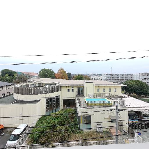眺望と抜け感(確度82%):前面は低層の建物と道路で、遠くまで視界が開けている。高い建物の正面対面は無く圧迫感は少ない。