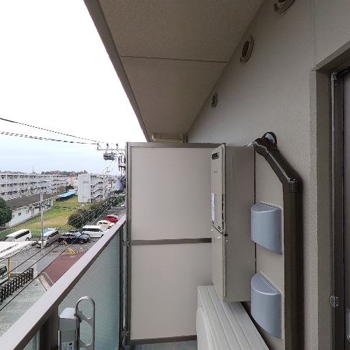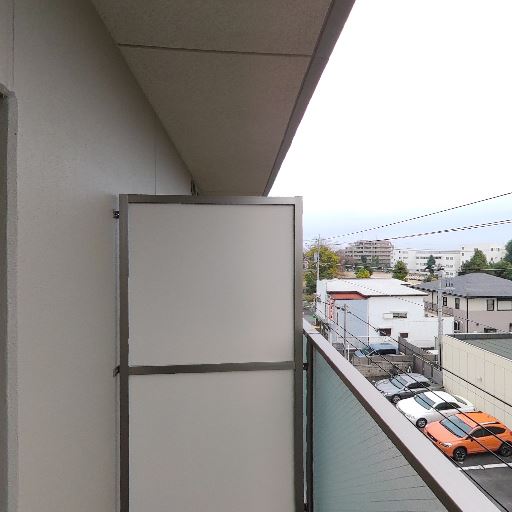 プライバシーへの配慮(確度69%):手すりは半透明ガラス、側面パネルで隣戸との視線は遮られているが、道路側からの視線は一部入りうる。