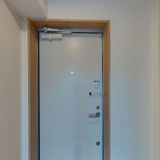 • 玄関ドアと防犯設備(確度80%):玄関はスチールドアでドアクローザーと覗き穴、ダブルロックと思われる鍵が確認できる。