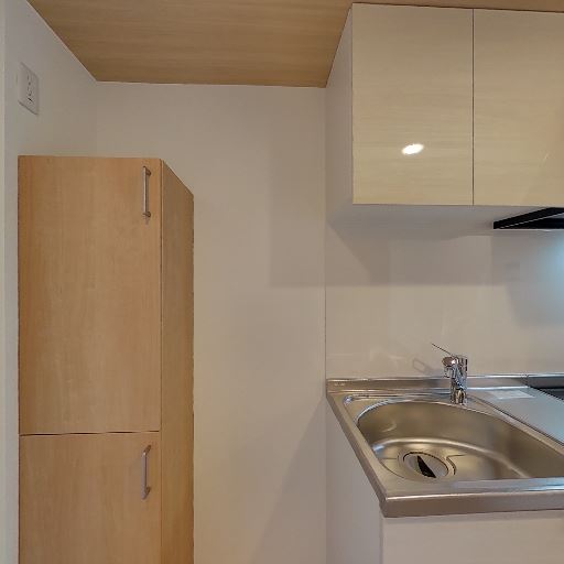 • コンパクトキッチン(確度78%):シンク一体型のステンレス天板と1口コンロスペース、上部吊戸棚・レンジフードがある。収納は多くはないが最低限は確保。