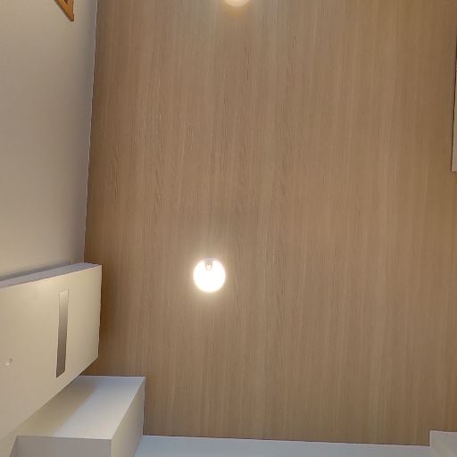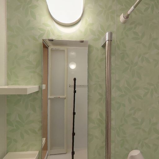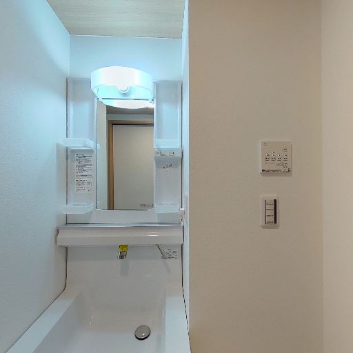• 独立洗面台と収納(確度86%):照明付きの独立洗面台があり、下部に収納が見える。壁面に操作パネルとスイッチも設置されている。