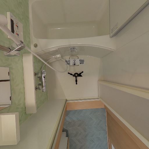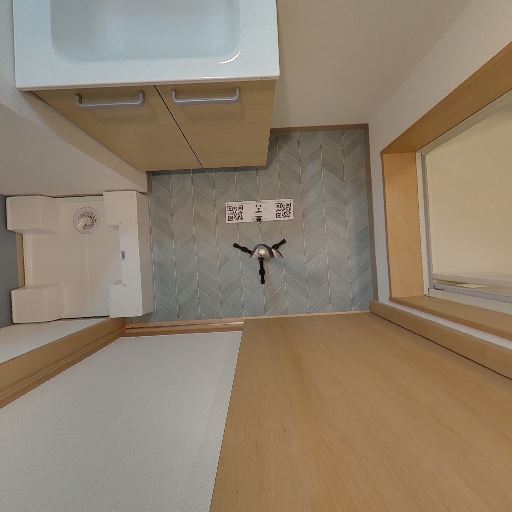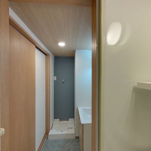 • 洗濯機置き場あり(確度83%):壁面に給水蛇口とコンセント、床に防水パンのスペースが見える。