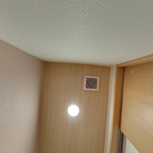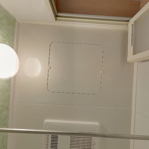 • 換気設備と照明(確度90%):天井に丸型の照明と換気扇グリルがあり、明るさと換気が確保されている。