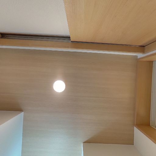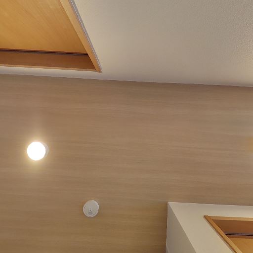 • 天井照明と火災報知器(確度72%):ダウンライトと感知器が設置されている。天井は木目調で統一感がある。