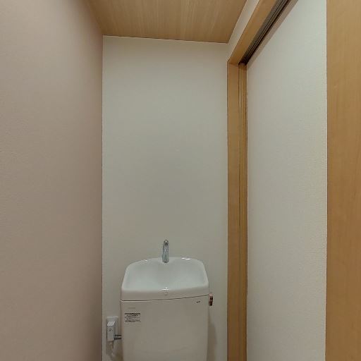 • 個室トイレの設備(確度86%):タンク一体型のトイレ本体と壁付けの紙巻器・操作パネルが確認できる。引き戸の出入口で省スペース設計。
