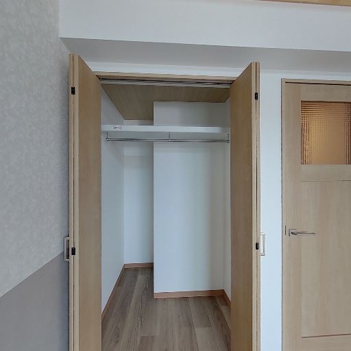 • 収納量のあるクローゼット(確度86%):折れ戸の奥に奥行きのあるクローゼットがあり、ハンガーパイプと上部棚が設置されている。