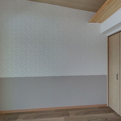 • アクセントクロスのデザイン(確度73%):壁の半分に花柄のような淡い模様のアクセントクロスが使われている。