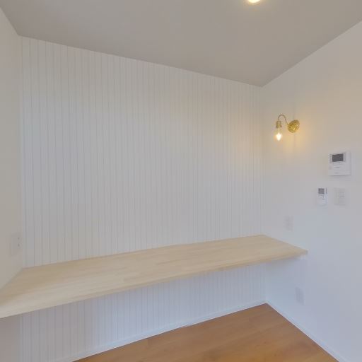 ワークカウンターの設置(確度83%):壁付けの長いカウンターとブラケット照明があり、作業や食事スペースとして使えそう。